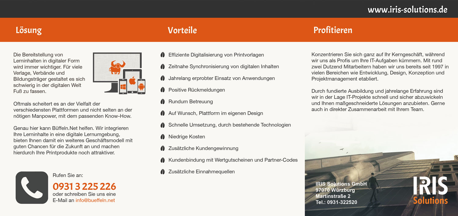 Ein Faltblatt im Zick-Zack-Falz das für weitere Kundenaquise auf der Frankfurter Buchmesse gedacht war: